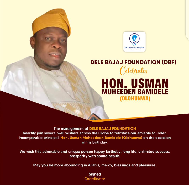 The Coordinator of Dele Bajaj Foundation and CEO Pattern Agro Ventures, Mr Oke Wasiu (Pattern) has rejoiced with Hon. Usman Muhedeen (Olohunwa) CEO BMU, founder of Dele Bajaj Foundation, a non political and non-governmental organisation, as he celebrates another productive year of existence.