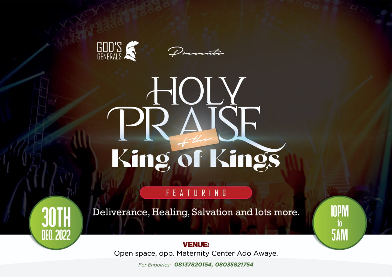 Ado-Awaye town in Iseyin Local Government will receive people from all works of life as God’s Generals holds holy praise night on the 30th December, 2022.