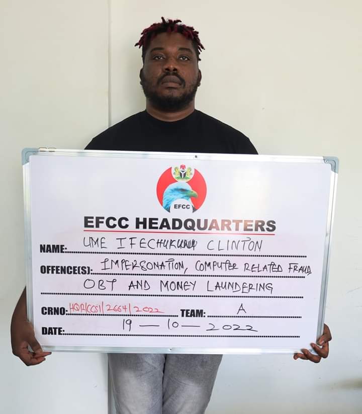 Operatives of the Economic and Financial Crimes Commission, EFCC, have arrested a 29-year old Ume Ifechukwu Clinton for impersonation, computer related fraud, obtaining by false pretence and money laundering.