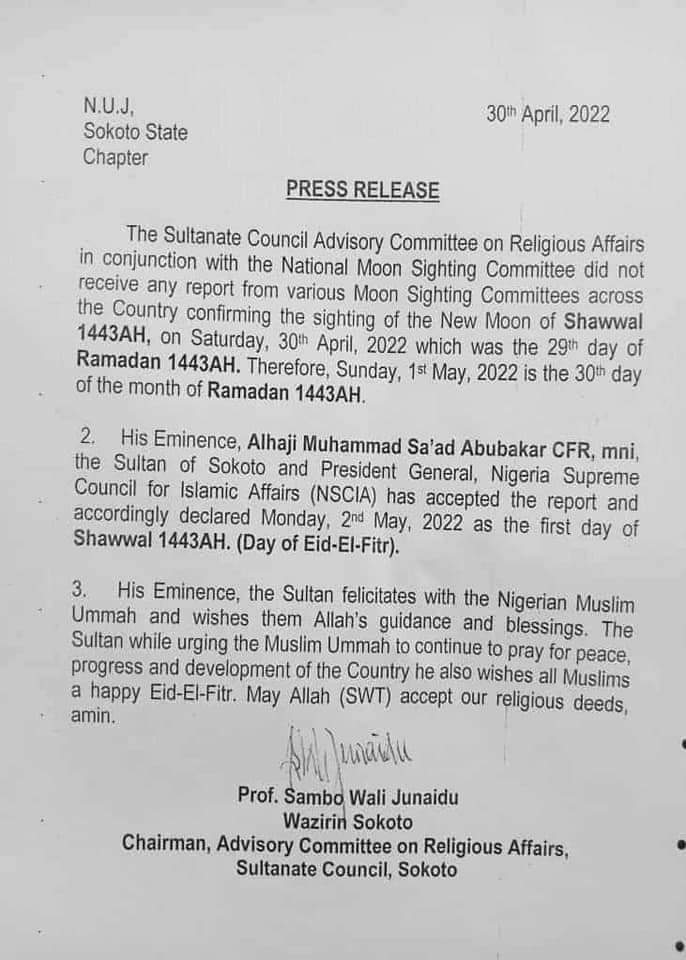 The Sultanate Council Advisory Committee on Religious Affairs in conjunction with the National Moon Sighting Committee did not receive any report from various Moon Sighting Committees across Nigeria today, therefore Sunday 1st May, 2022 is the 30th day of the month of Ramadan.