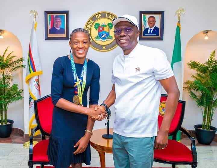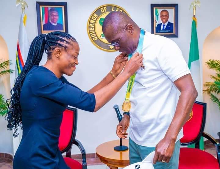 Miss Odunayo Adekuroye a gold medalist at the commonwealth Olympic game and world gold medalist at Birmingham in the wrestling category paid a courtesy call on Governor @jidesanwoolu at the Lagos house Marina. The snapshots below are for photostory.