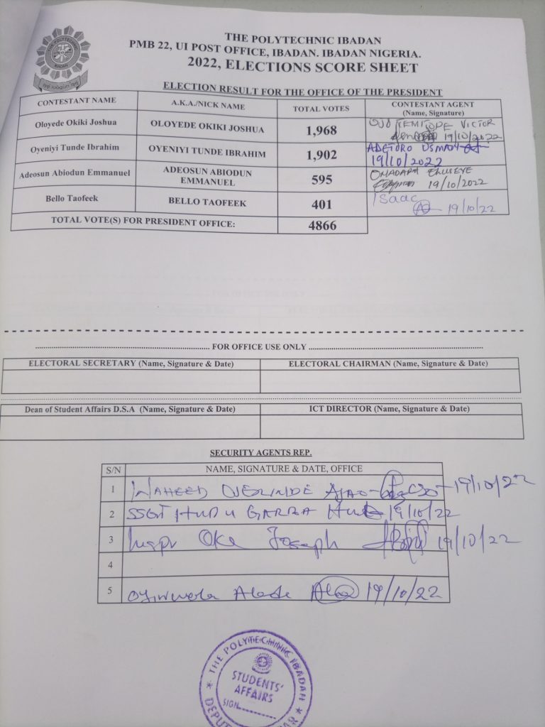 The copy of the results for the top position of the president as announced by the Dean of students’ Affairs, Mr. John Akinwumi Makinde as attached below: