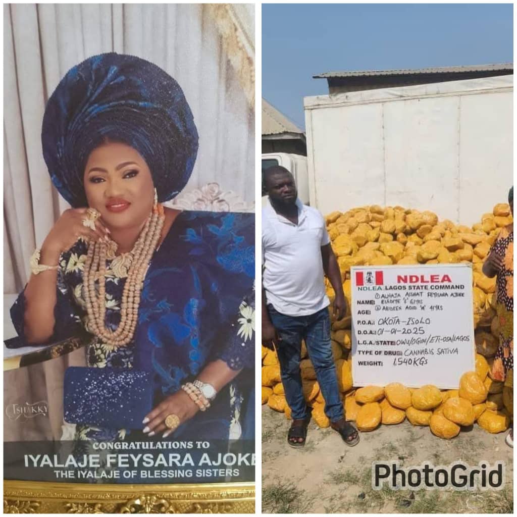 Operatives of the National Drug Law Enforcement Agency, NDLEA, started the new year with the arrest of a wanted drug kingpin and Lagos socialite, 61-year-old Alhaja Aishat Feyisara Ajoke Elediye on Wednesday 1st January 2025 in her mansion at Okota area of Lagos following the interception of a truckload illicit drug consignment from her staff same day.